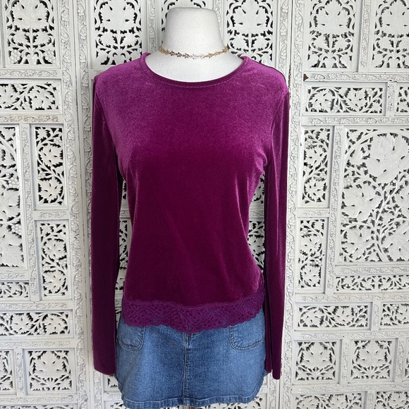 Y2K Magenta Purple Velvet Lace Trim Crew Neck Coquette Blouse Sz Medium