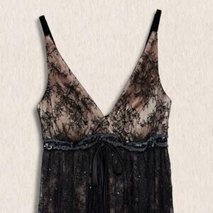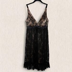 Elegant Marc Bouwer “Glamit” black lace overlay babydoll dress, size 4, with nude champagne lining, beaded empire waist, and ribbon tie. Sheer lace skirt with subtle sequin shimmer adds movement and drama. Perfect for cocktail parties, formal dinners, date nights, or as a romantic gothic glam statement piece.