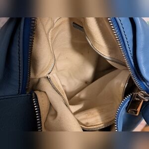 In overall great condition. There is some rubbing near the handles and one other small spot on the side. I do feel they could recover with a good leather conditioning. There are some minor blemishes on the interior that could definitely come out. I am not trained in doing these things myself. Interior zipper pocket. Silver tone hardware. 16×11.