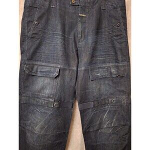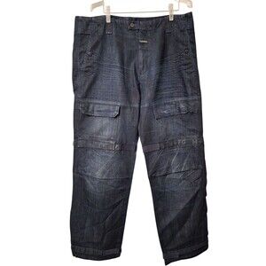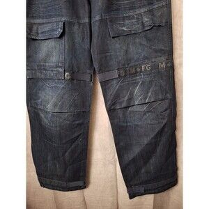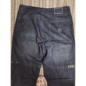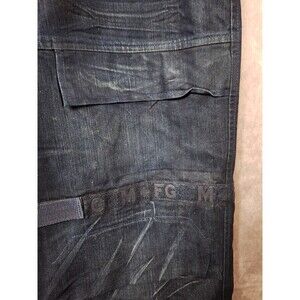 The Y2K Marithe Francois Girbaud Wide Leg Baggy Jeans are a vintage-inspired piece for men's fashion. These jeans feature a high-rise waist and a relaxed fit, making them comfortable for everyday wear. The denim fabric is durable and easy to care for, while the cargo pockets add functionality to the classic 5-pocket design. With a solid dark wash and button and zipper closures, these jeans offer a stylish and versatile option for any season. Perfect for those who appreciate the hipster, festival, and 90s themes, these jeans are a must-have for any fashion-forward individual. HAS SOME STARCH MARKS BUT OVERALL IN EXCELLENT CONDITION. Length 47.5 in. Inseam 34 in.