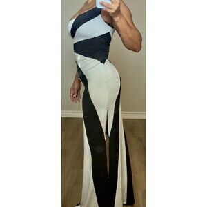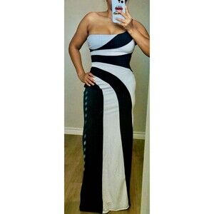 Y2K Maxi Dress one shoulder Stretch Stripes White Black Size M USA shimmery