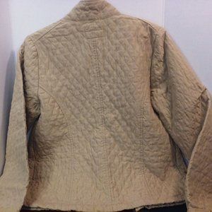 Y2K 2002 Coat Merona Puffy Diamond Quilted Moto Jacket Women's -Medium button flap Pockets Full Zip Long Sleeve Buckles, finished seams, lightweight easy care washable 100% polyester in shades of Tan. In great pre-owned* condition with no outwardly visible flaws - right cuff + elbow smudge/spots - little dingy, needs a wash/soak in Oxyclean - left sleeve buckle is cracked but functions - see pics.