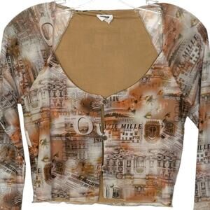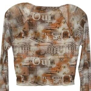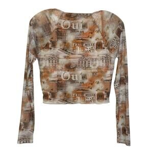 Y2K Mesh Crop Top Long Sleeve Fitted Cropped Shirt Sz Small Brown, Cream, Orange