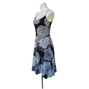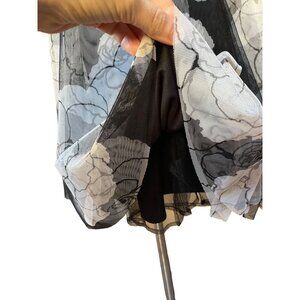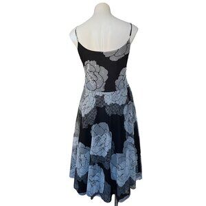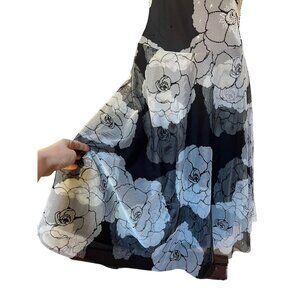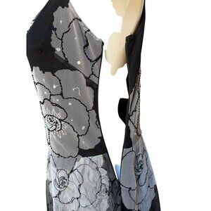 The BCBGMAXAZRIA Y2K Mesh Tulle Floral Beaded Dress is a semi-formal, fit and flare tea length cocktail dress. Perfect for afternoon weddings or garden parties, this size 10 dress features a ballet core, romantic, coquette aesthetic in black and white. This garment, because of the material, has a light amount a stretch.