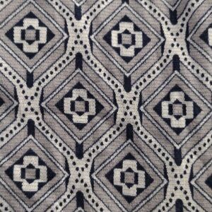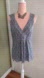 Grey with blue medallion geometric prints on a sheer & delicate, textured nylon shell. Low v neckline, with stretch bodice & light front pleating. Flowy hem. Fully layered, in a soft navy blue polyester. Sleeveless, with gathered shoulders. 100% nylon