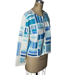 This Michael Simon cardigan sweater features a mod type of "plaid", consisting of various decorative stitches and felt fabrics in a blue palette. It closes down the front with white crocheted buttons. There is a very pretty scalloped stitch at the hem and end of the sleeves. The yarn is 55% ramie, 45% cotton. There are thin shoulder pads attached. It is dated 2001. Excellent condtion.