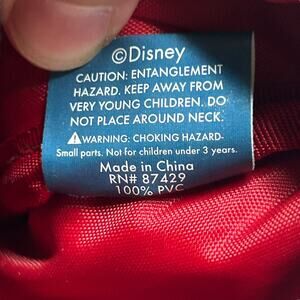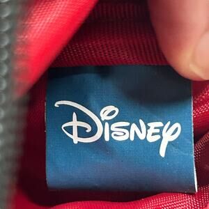 • Design Features: Glossy vinyl overlay with Mickey Mouse print, red sequin shorts, interior zipper pocket, Mickey-head zipper pull, contrast white stitching
