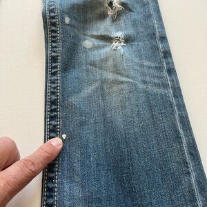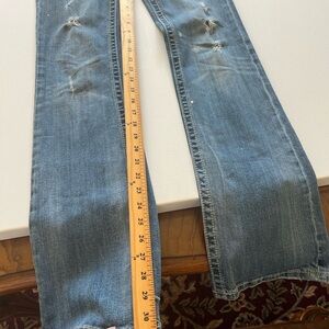 These Y2K Miss Me jeans feature a classic boot cut style in a versatile blue denim. The standout feature is the intricate fleur-de-lis embroidery on the back pocket, adding a touch of elegance to the casual design. With a subtle worn-in look, these jeans are perfect for everyday wear. (D5)