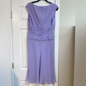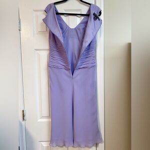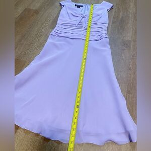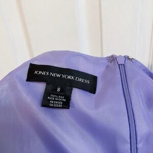 This is a lavender-colored silk dress by Jones New York. It features a V-neckline with a tie detail at the bust, a ruched waist, and a flowing skirt that reaches around the lower calf. The dress is sleeveless and is fully lined. It is made of 100% silk and is in great condition! Perfect for a party, event or to attend a wedding. Laying flat it measures approximately 15.5” across the chest, 14.5” across the waist, 16” across the hips and 42” in length.