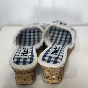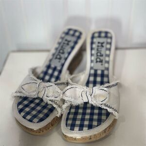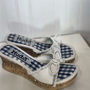 Y2K Mudd Gingham Wedge Sandals 7.5M Blue White Bow Cork Platform Coastal Cowgirl