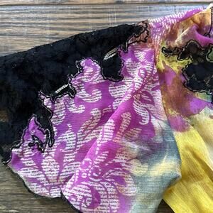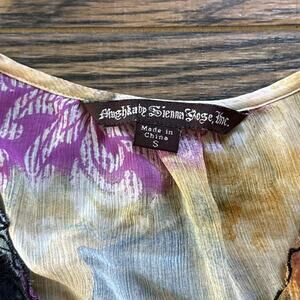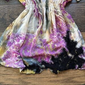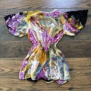 Y2K-era Mushka by Sienna Rose sheer boho top in women’s size small. Lightweight crinkled fabric with a colorful abstract tie-dye pattern in purple, orange, yellow, and cream tones. Features a cinched elastic waist for a flattering fit, flutter sleeves, and black lace trim detailing for a romantic vintage look.