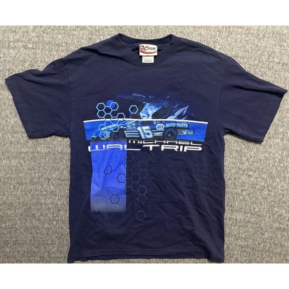 This Y2K NASCAR Michael Waltrip Chase Authentics T-Shirt is a vintage piece that captures the essence of the 2000s era. Featuring a classic fit and short sleeves, this men's medium shirt in blue showcases the iconic Michael Waltrip character. Made by Chase Authentics, this regular-sized t-shirt is perfect for fans of vintage NASCAR apparel looking to add a nostalgic touch to their wardrobe.