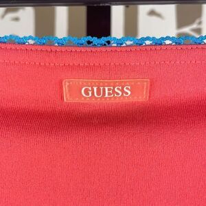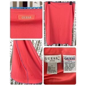 Y2K NEW Guess Blaze Orange Mesh Skirt Swim Coverup sz L. Features a bright coral orange 100% nylon mesh, turquoise blue lace trimmed waistband, turquoise exposed stitching down sides, turquoise lettuce edge hemline, fully lined, pull on style. This is a brand new vintage Y2K piece - still has the original plastic tag holder but the tags have been removed - there is a small snag inside on the lining near the waistband but it’s not noticeable when on. If you love Y2K styles or if you are looking for a new skirt to take on your next cruise or beach vacation, don't miss out on this great piece - it can double as a swim coverup too! Size L. Measurements taken laying flat are approximately: 14.5" across waist, 21” length from front center of waistband down front center hemline, 20” across hips. I happily answer questions prior to purchase!
