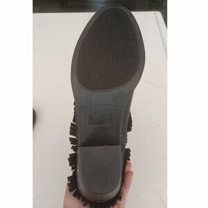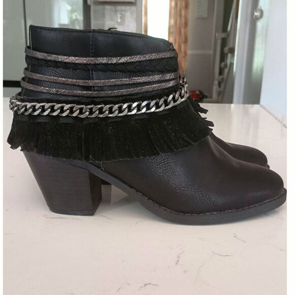 Nwot Rampage black ankle booties Chelsea style Y2K zip closure on inside ankle. Suede Fringe with layered faux leather and chain traps gorgeous embellishments very boho Western hippie earthy eclectic coastal wild child '90s throwback women's size 8