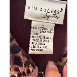 Add a touch of Y2K flair to your wardrobe with this stunning, new with tags Kim Rogers blouse! This women's size large top features a beautiful brown color with an eye-catching animal print that's sure to turn heads.