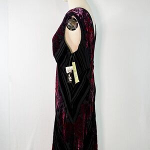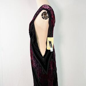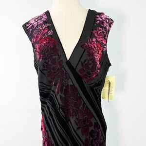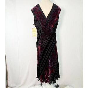 Vintage brand Muse sold by Lord & Taylor New with tags Late '90s / Y2K fluttery fairycore whimsigoth bias cut dress midi about knee length depending on height Black with Black lines and jewel tone burnout floral designs. V-Neck and sleeveless. Side zipper closure. Size 14 see measurements below. It's much smaller and possible from the Junior section. It seems to be more a size 8 or 10. Double check your measurements with the ones below. No defects. Never worn. Tags still attached. Dry Clean Only; 70% Rayone and 30% Silk Zipper side closure. Measurements: Pit to Pit: 19" Waist across: 16" Hips across: 18" Hem across: 25" Length: 40.5"