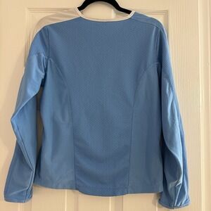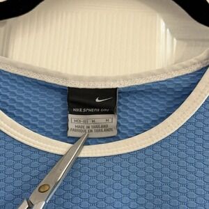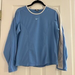 Vintage Y2K Nike Sphere Dry. Women's medium (8-10) baby blue crewneck long sleeve. Has a white stripe & fabric details all around. Great for working out, outdoors, casual wear top shirt. Measures 18.5in underarm 22in length