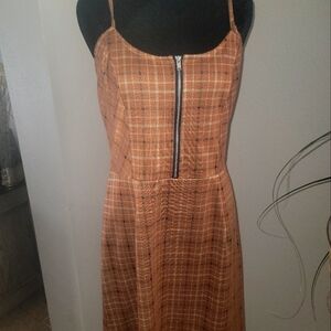 Chic brown plaid midi dress with front zipper. Ideal for casual wear.