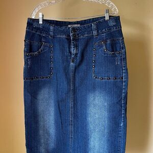 Y2K denim skirt, vintage jean skirt, studded pocket skirt, 2000s midi skirt, No Fuze denim, blue pencil skirt, stretch denim, grunge style, Y2K fashion, retro streetwear, casual vintage outfit, 90s 2000s aesthetic, women's size 16 skirt, faded denim skirt, classic blue jean, early 2000s style, modest midi skirt, pocket detail skirt, vintage closet staple, Y2K wardrobe essentials