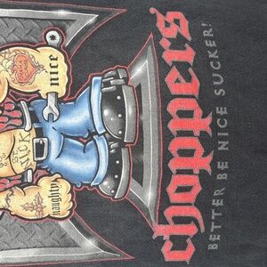 Y2K North Pole Choppers Santa biker graphic LG black & red t-shirt is in good shape with normal vintage wear. Good wash wear and fade. No hole's no stains, no loose threads. pit/pit 20 length 29