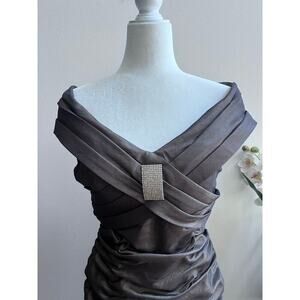 Y2K Off-the-Shoulder Ruched Stretch Taffeta Elegant Dress Gray Brooch Womens 10