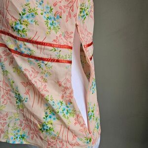 Chiffon and satin floral babydoll top with a pink ribbon detail. Side zips up for a perfect fit. V-neck wrap bust. Made in Spring 2005!