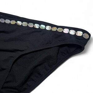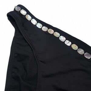 Stylish black bikini bottom featuring mother of pearl accents along the waistband. Perfect for a chic beach look.