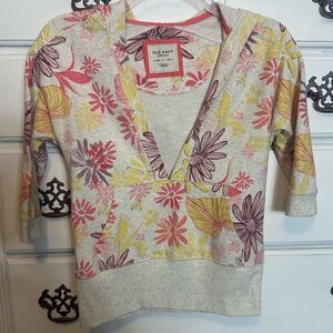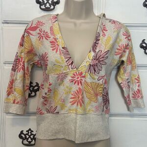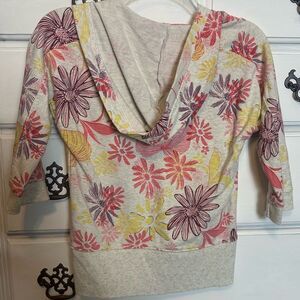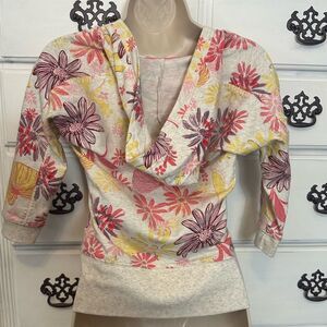 Y2K Old Navy Floral Hoodie. Features all over floral pattern with front kangaroo pouch and wide band at hem. Elbow length sleeves and exposed stitching at shoulders. Sized girls large but could fit women’s S as shown on mannequin. Excellent used condition.