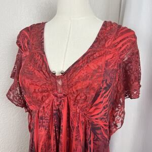 Y2K One World Top Womens Medium Red Lace Babydoll Tunic Fairy Whimsigoth Boho