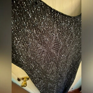 Fantastic flattering knit overlay column dress with knee high slit. Black with silver metallic threat. Vintage Onyx Nite by Wendy E Chaitin. Y2K very Rachel or Monica Friends vibe. Elegant yet seductive. Perfect condition and fully lined. Sz 10 Shimmers in candlelight