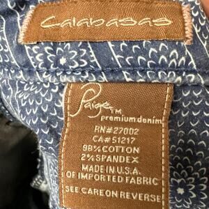 Paige Women's Calabasas jeans. These low-rise, flare jeans feature a stylish button front and a raw hem for a boho-chic look. Perfect for festivals and fun outings, they offer a flattering fit that's both trendy and timeless.