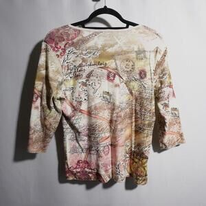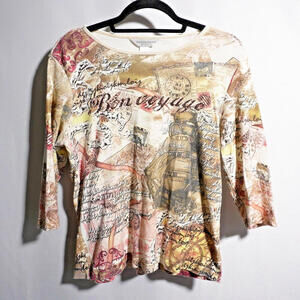 Y2K Paris Travel Graphic Sleeve Knit Shirt Rhinestones USA Made Womens P/L 2000s VTG Vintage 3/4 long sleeve Lorelai Gilmore Girls top rock Bon Voyage aop all over print breathable petite large