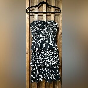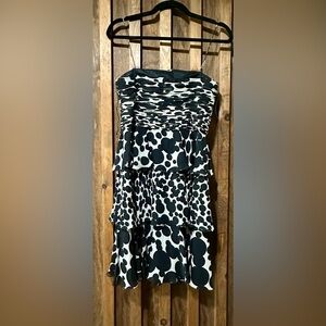 Giving 2004 red carpet meets prom afterparty in the best way possible. This vintage Y2K Donna Morgan dress is a certified time capsule of flirty chaos. Featuring a ruched strapless bodice, tiered ruffle skirt, and a polka dot pattern that shifts sizes like your AIM away messages shifted moods. Made from 100% silk with a high-contrast black-and-white vibe—because subtlety wasn’t in style back then, and honestly? Still overrated.