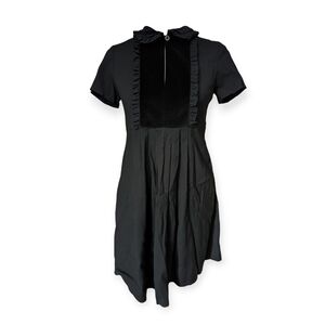 This elegant black cotton mini dress showcases a distinctive ruffled front panel and a stylish peter pan collar. Featuring short sleeves and a fitted bodice that transitions into a flared pleated skirt. School girl chic and super trendy.Zipper closure with a button at the collar. There is no stretch.