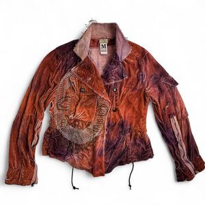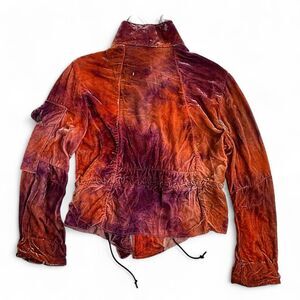 Rare People of the Labyrinths (POTL) velvet jacket in rich hand-dyed shades of orange, crimson, and violet. Made in Holland from a luxe rayon-silk blend, this avant-garde piece features intentional raw edges, asymmetrical button closures, sleeve zippers, flap pockets, and a striking geometric embroidered motif. Cropped cut with adjustable drawstring waist. A true collector’s item from the Dutch cult label known for wearable art.