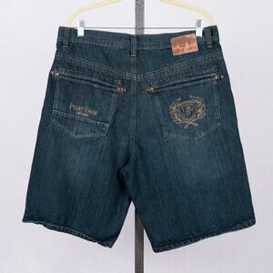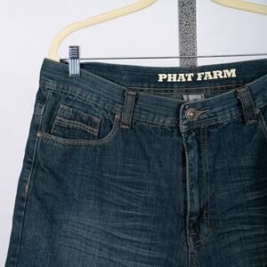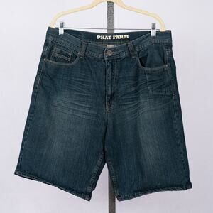 Pre-Owned: Y2K Phat Farm Denim Jean Shorts; Men's SZ 36; Embroidery on Back Pockets; 5 Pocket Design; 100% Cotton; Leather Accent on Back Pockets. This item is in good, pre-owned condition with some wear on the back logo tag--See photos. No rips, holes, or stains. Please check measurements before purchasing. Measurements: