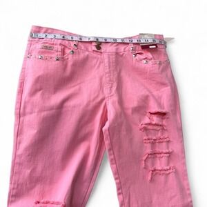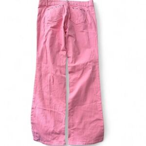 Y2K Pink Low Rise Studded Ripped Flare Jeans. Feature gold and silver metal pyramid and balls along pockets in front and back. Also large ripped area at upper leg on one side and knee on other. #y2kfashion #pinkjeans #studdedjeans #flarejeans #y2Kstyle
