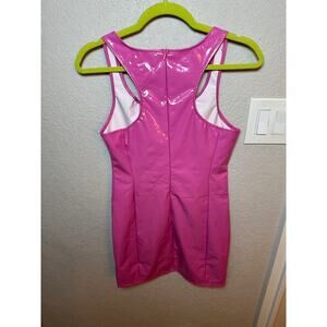 y2k pink vinyl dress, patent leather mini dress, club kid outfit, bratz doll dress, barbiecore fashion, xs pink mini, early 2000s vinyl dress, rave outfit pink, shiny latex look dress, unbranded pink dress, costume party dress, barbie halloween outfit