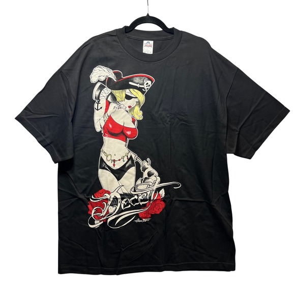 A bold graphic tee featuring a striking pirate girl design. This eye-catching shirt showcases a detailed illustration of a blonde pirate woman with a red top, black bottoms, and a pirate hat, surrounded by roses and the word "Deceit" in a stylized font. The design is printed on both the front and back of the shirt, making it a standout piece. This tee offers a comfortable fit and a unique aesthetic. Excellent Like New Condition