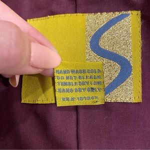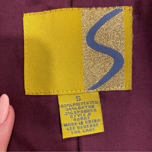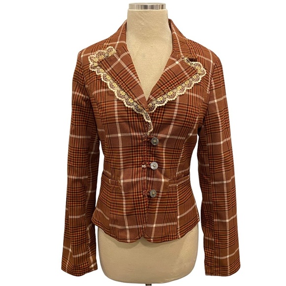 Fitted plaid blazer in warm chestnut brown with ivory and gold lace trim along the lapel. Features a button front closure with mother of pearl buttons, a cinched waist and structured fit, and a subtle peplum-style back hem for a flattering silhouette. Fully lined in plum satin. 63% polyester, 34% rayon, 3% spandex.