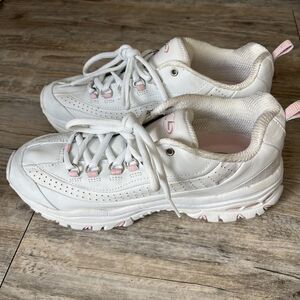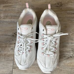 Y2K Champion Platform Sneakers in white and pink — women’s size 10. Vintage chunky trainers with classic 2000s style, featuring thick soles, retro detailing, and that perfect pop of pink. A must-have for Y2K lovers and vintage sneaker fans.