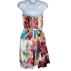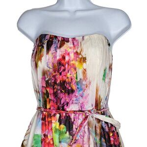 Tags: retro, party, spring, spring wedding, summer dress, strapless floral dress, white watercolor dress, Single Women's Small, pleated skirt dress, watercolor floral pattern, chic strapless dress, versatile wardrobe addition, flattering fit dress, occasion dress, designer dress, unique dress design