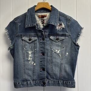 Y2K Plugg Womens Grunge Boho Streetwear Denim Vest Size M Embroidered Bleached