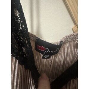 This Y2K mini slip dress by Poof is a stunning addition to any wardrobe. The dress features intricate gold and black lace detailing, with a short dress length that's perfect for a night out. The dress is available in a size medium, making it a great fit for most women.