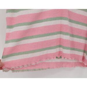 Soft ribbed knit crop top with a classic collar and open neckline. Features lettuce trim and pink, green, and white horizontal stripes in a stretch cotton-blend ribbed knit.