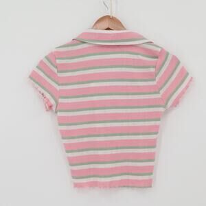 Y2K Preppy Polo Crop Top Pink Green Striped Ribbed 90s Soft Girl Pastel Size L