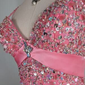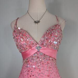Y2K Prom Dress Maxi Gown 0 Pink Vtg Princess Bead Mesh Halter Ball Glam Sequin