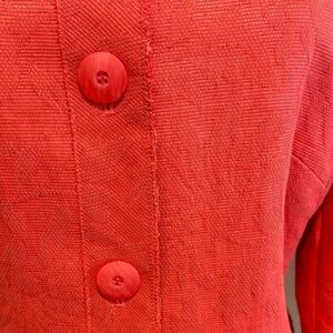 Embrace the spirit of Y2K fashion and immerse yourself in the whimsical charm of Talbots cottagecore with the raw edge cotton, viscous & nylon blend brocade, lined, structured, cropped blazer with front buttons and two shallow pockets. Whether you're wandering through sun-dappled fields or savoring a picnic in the countryside, this enchanting piece is sure to evoke a sense of romance and nostalgia wherever you go in this deep salmon orange Italian fabric. EUC like new in a plus size 14 petite.