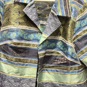 Vibrant jacket with blue, green, and black stripes. Features a unique pattern and open front design.