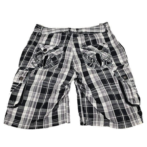 Y2K ROAR Mens Cargo Shorts Embroidered Plaid Black Utility Grunge Skater Size 33